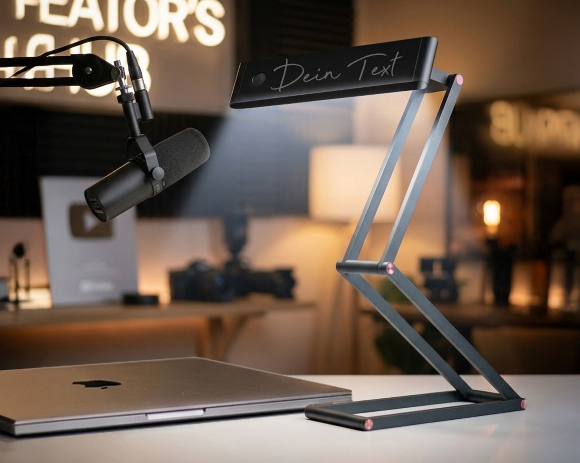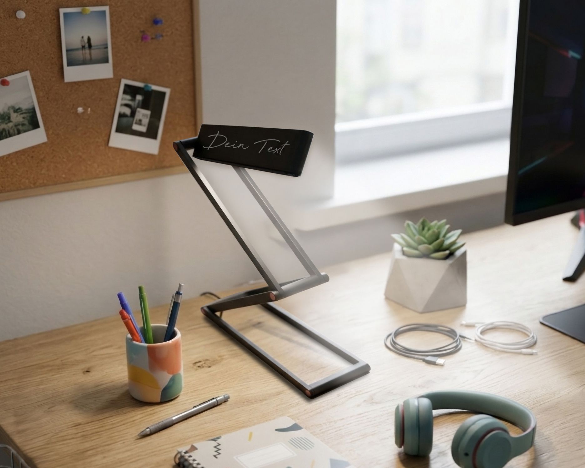Schluss mit langweiligen Schreibtischlampen. Die Flexline LED ist ein wireless Design-Statement aus Aluminium, das sich verwandelt. Falte sie an drei Achsen und sie wird zum Smartphone-Halter, Wall-Spotlight oder zur Taschenlampe. Dimmbares Licht, 3h-Akku. Im Konfigurator wird sie zum Unikat: Wir gravieren dein Logo oder deinen Namen elegant auf das Metall. Das ultimative High-Tech-Geschenk.