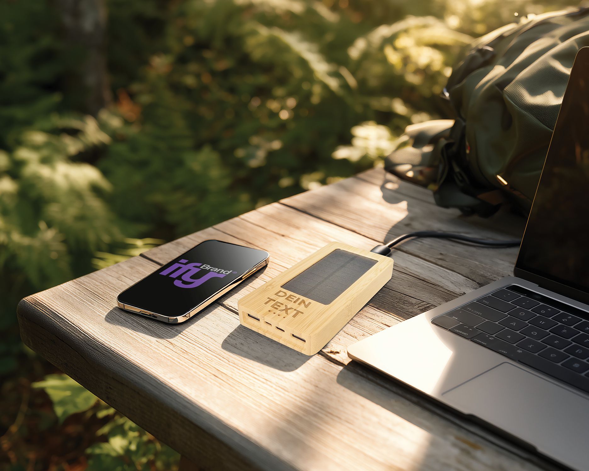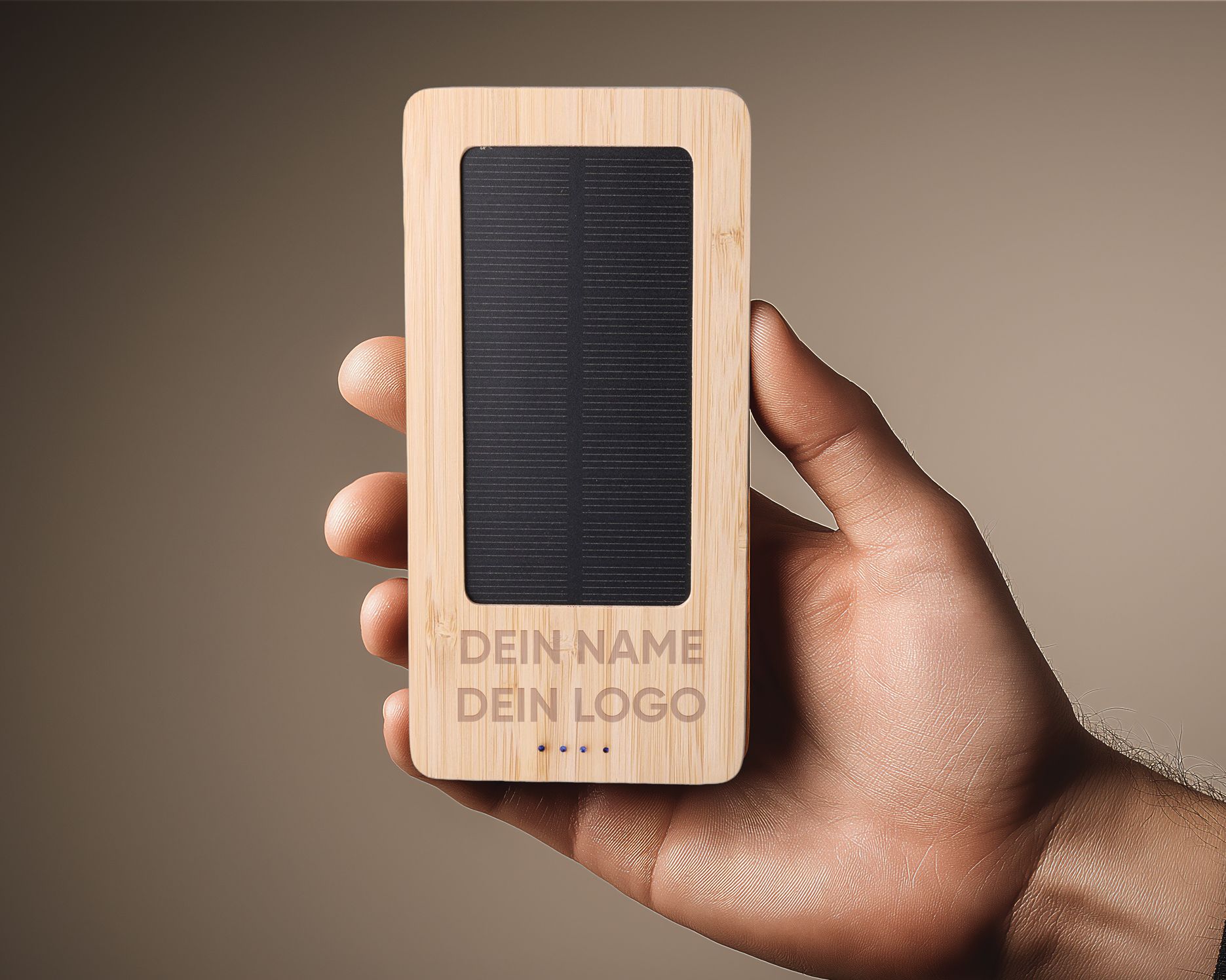 Nie wieder leerer Akku! Diese 8.000mAh Powerbank ist dein Eco-Held: Sie ist aus echtem FSC-Bambus UND lädt sich per Solarpanel in der Sonne selbst auf. Sie kann 3 Geräte gleichzeitig laden! Im Konfigurator wird die riesige Bambusfläche zu deiner Leinwand: Graviere „Adventure Fuel“, „Sonnentankstelle“ oder deinen Namen. Dein perfekter, autarker Begleiter (in Geschenkbox).