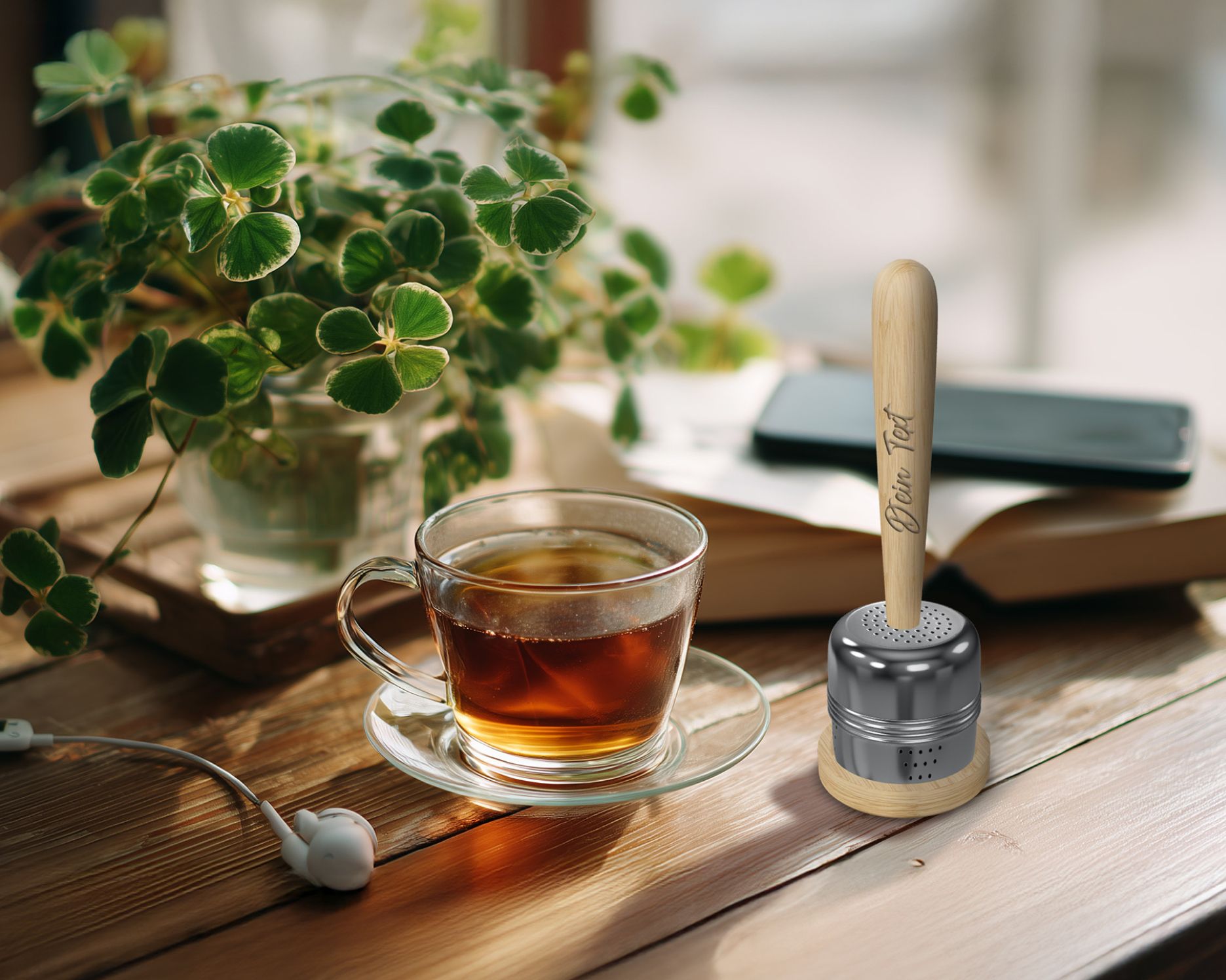 Schluss mit Tropf-Chaos! Dieses geniale 2-teilige Tee-Ei aus Edelstahl hat einen edlen Griff aus Buchenholz. Der Clou: Der passende Holz-Untersetzer sorgt für sauberes Abstellen. Im Konfigurator machst du es zum Unikat: Graviere Griff mit „Tea Time“ oder „[Name]s Auszeit“. Das perfekte, stilvolle Geschenk für Teeliebhaber.